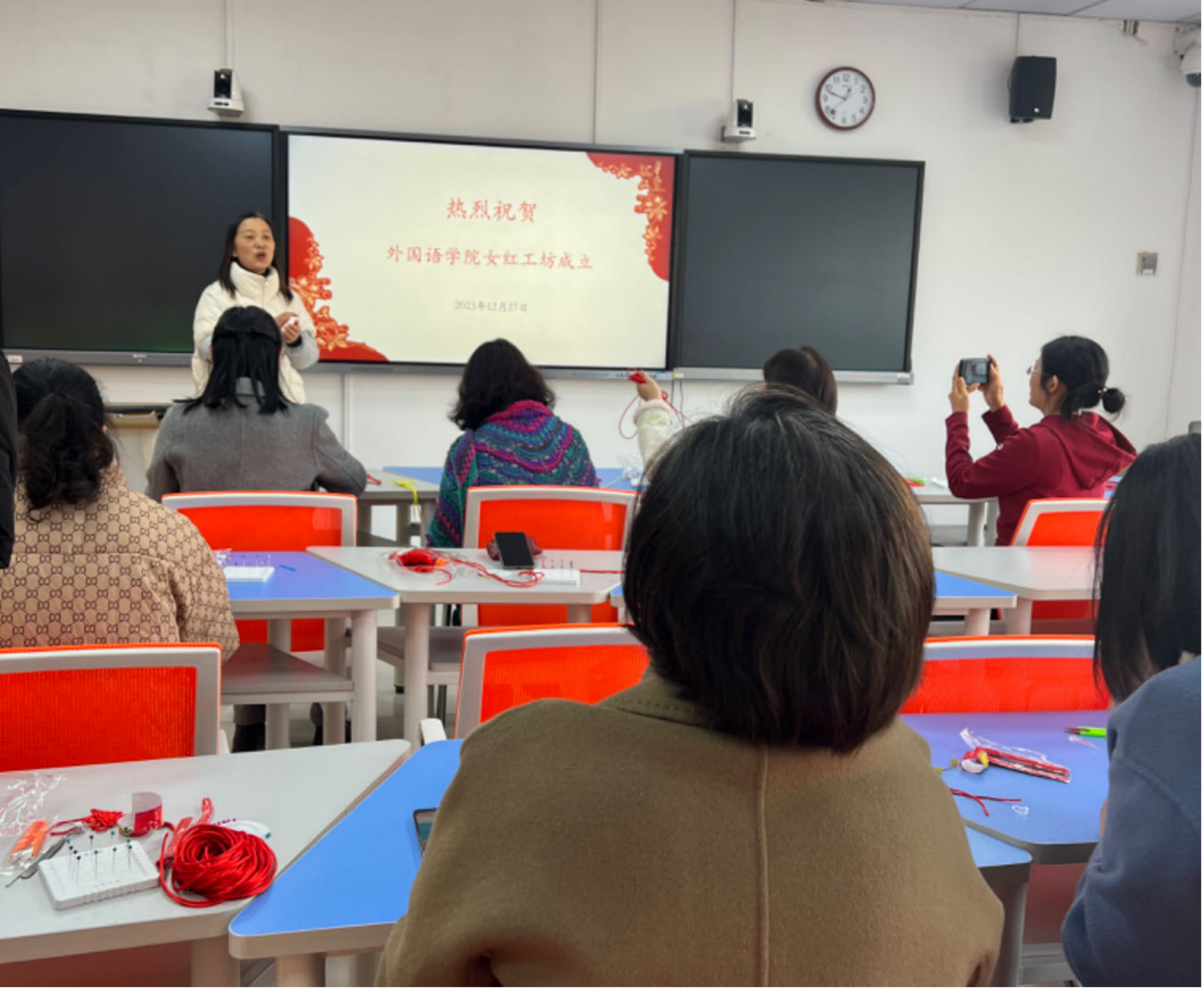 随后,妇女老师们积极参与了迎新年中国结的制作。中国结作为中国传统手工艺品的代表,寓意着吉祥、团结和幸福。老师们一边学习编织中国结的技巧,一边互相交流心得,共同完成了一件件精美的作品。